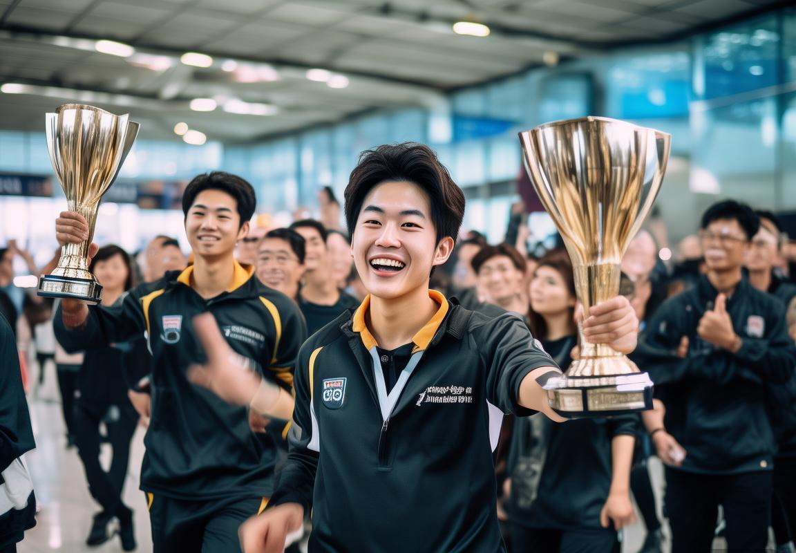 冠军战队GEN成员们手持闪耀的奖杯,面带胜利的笑容步出仁川机场。他们统一穿着队服,精神饱满地向接机人群挥手致意。经历了长途飞行的选手们虽然略显疲惫,但眼中仍闪烁着夺冠后的兴奋与自豪。战队教练和工作人员紧随其后,共同分享着这份属于整个团队的荣耀时刻。